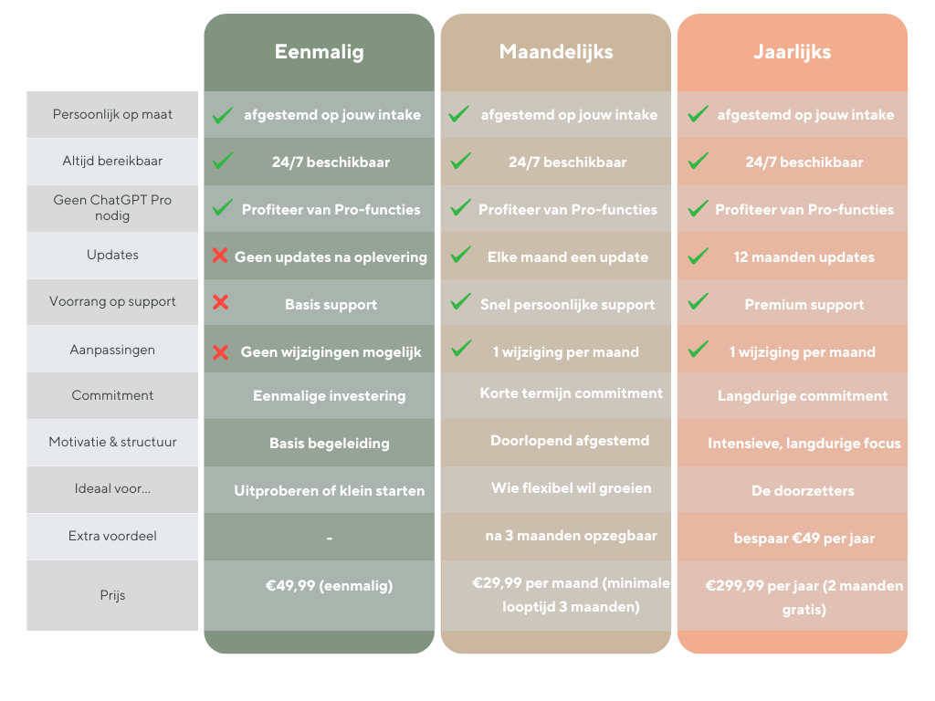Ik bouw een persoonlijke GPT-coach, gebouwd op jouw intake, doelen en leefstijl.